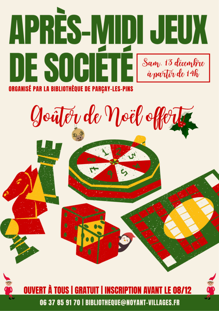 L’équipe de la bibliothèque de Parçay-les-Pins vous invite à partager un moment convivial lors d’une après-midi jeux de société ! Venez découvrir une sélection de jeux pour petits et grands, dans une ambiance détendue et familiale.