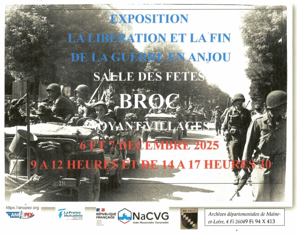 L’Association Nationale des Combattants des Opérations Extérieures (ANCOE) est heureuse de vous inviter à son exposition “La libération et la fin de la guerre en Anjou”, qui se tiendra les 6 et 7 décembre 2025, à Broc, de 9h à 12h et de 14h à 17h30.