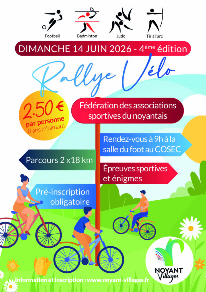 Toujours déterminés et passionnés dans nos sports respectifs, nous partons pour une 4ème édition de ce rallye vélo familial et sportif le dimanche 14 juin 2026 à partir de 9h00. Départ à la salle du foot, au COSEC à Noyant.